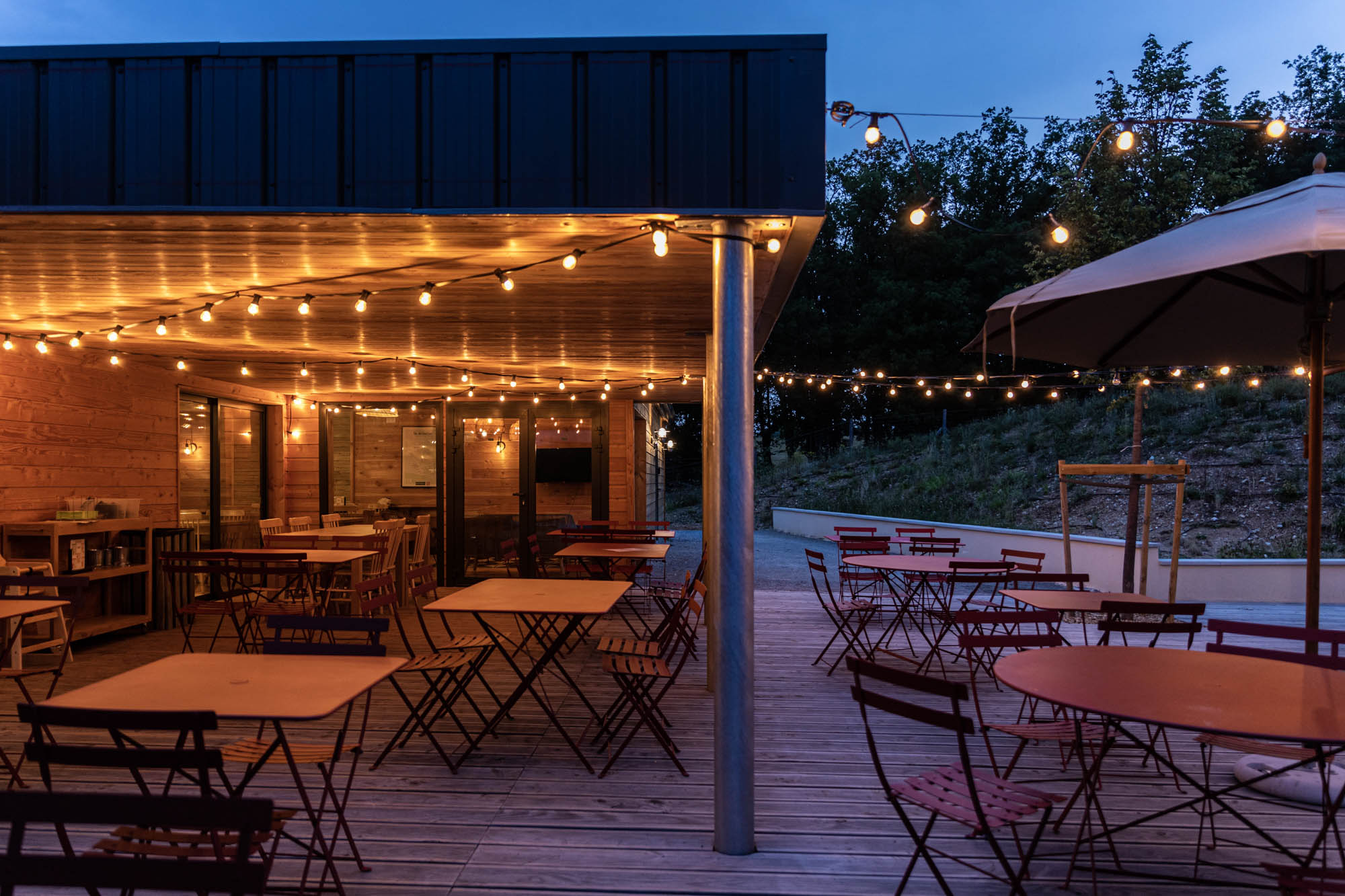 Par ailleurs, Huttopia propose un espace commun où l’on peut commander petits-déjeuners, des bières ou vins locaux et des choses à grignoter. Des jeux de société et de la documentation touristique sur la région y sont également disponibles.