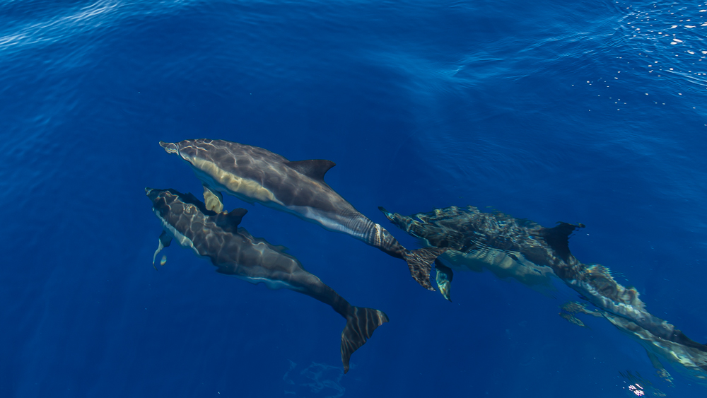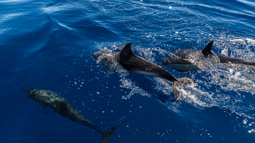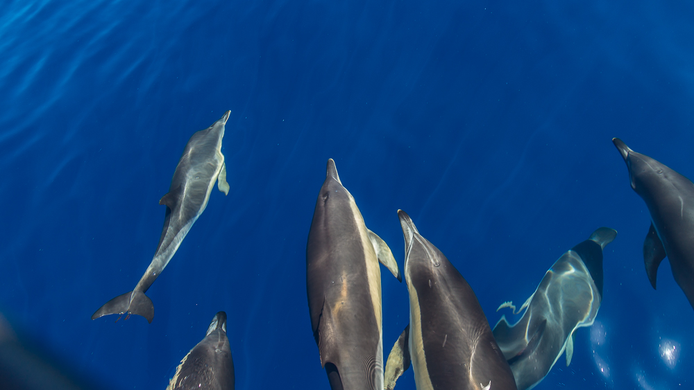 L’approche est respectueuse et les dauphins curieux profitent des vagues créées par le bateau pour se déplacer à toute vitesse. Tout autour de nous, ils se croisent, passent sous le bateau, repassent, sautent. Une douce euphorie semble partagée entre les humains subjugués et les dauphins qui nagent tout autour. Il y a des instants comme celui-ci, qui resteront à jamais gravés dans ma mémoire…