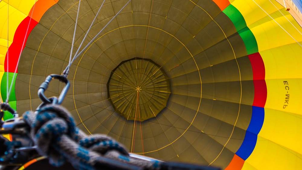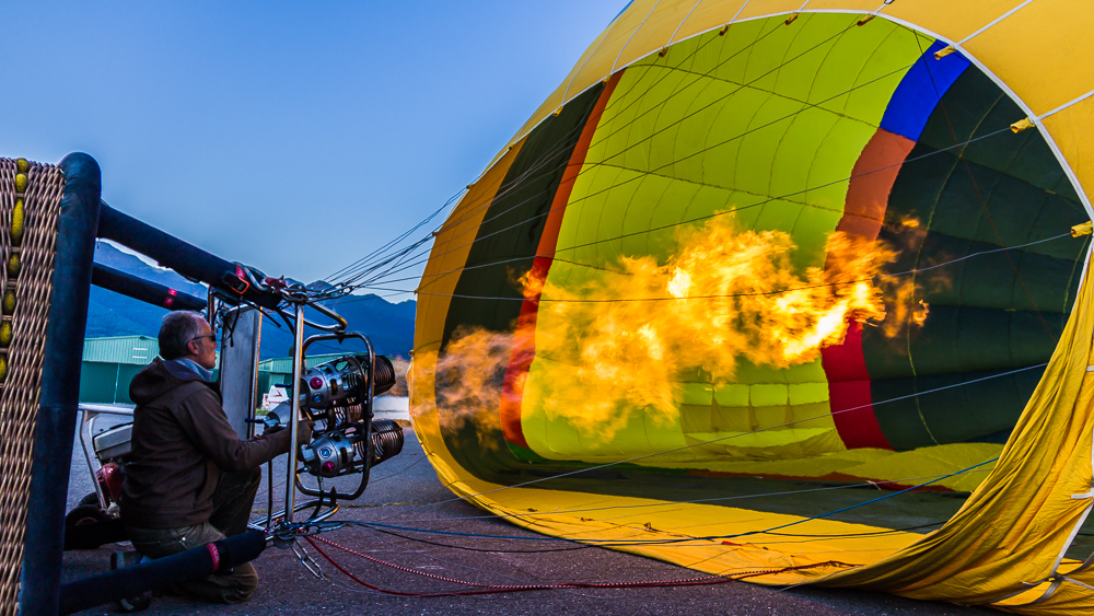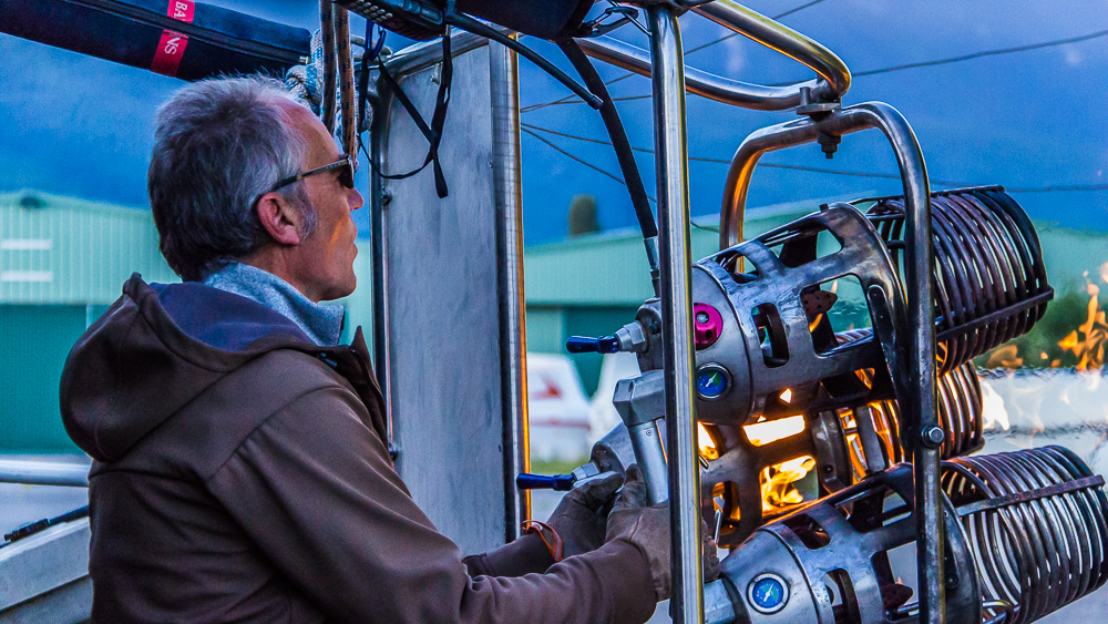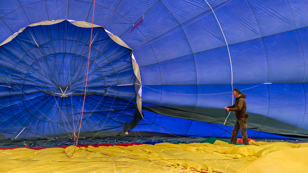 Après avoir vérifié le bon état de marche des brûleurs (entre autre), notre pilote s’est attelé à remplir le ballon d’air à l’aide de (très) gros ventilateurs. Ensuite, il a allumé les brûleurs pour que l’air chaud emplisse l’immense toile, et la nacelle s’est redressée, lentement.