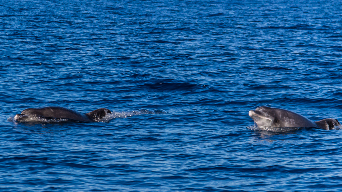 Ce matin là nous avons eu la chance d’observer 3 espèces de dauphins : Des dauphins communs, des grands dauphins et des dauphins rayés.