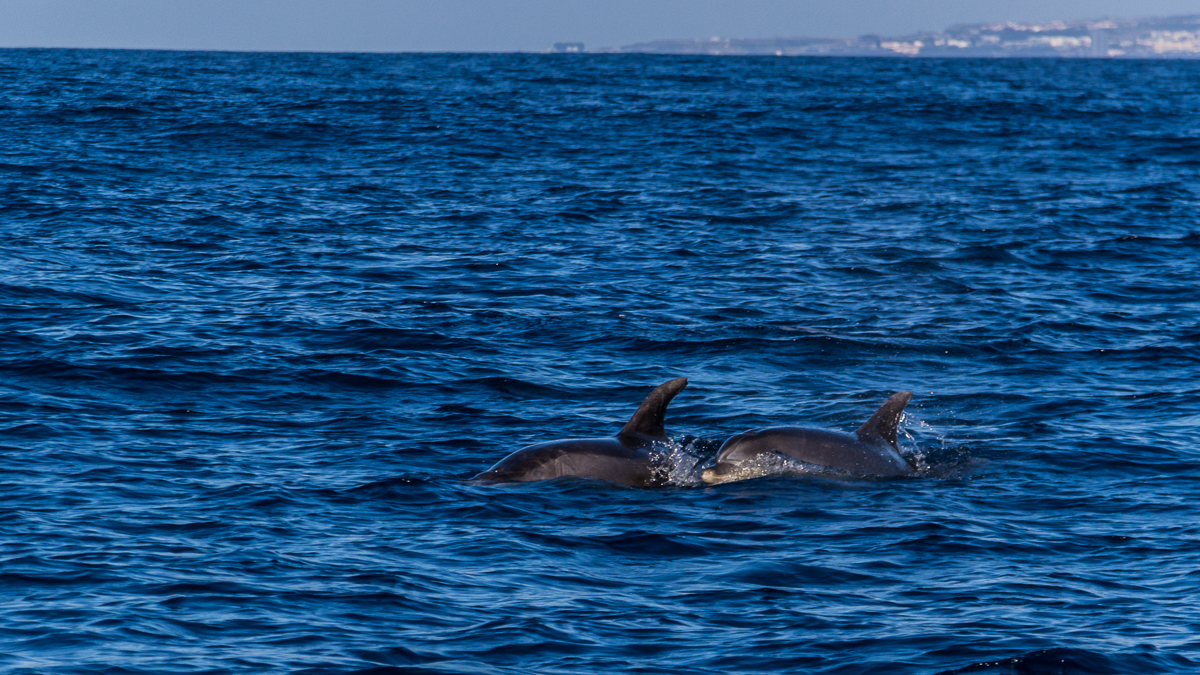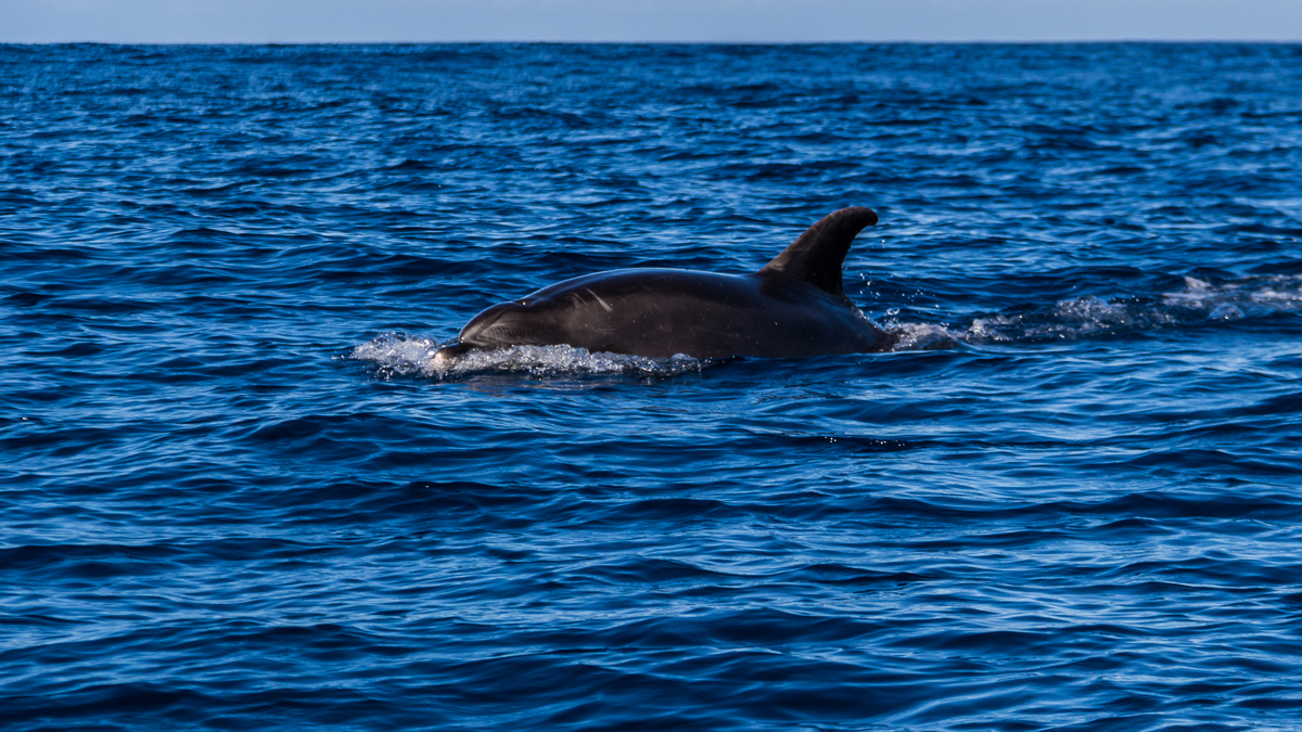 Tout autour de nous, les dauphins surgissent et disparaissent presque aussitôt, engloutis par l’océan. Ces apparitions sont ponctuées de quelques exclamations de surprise des passagers.