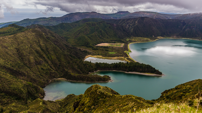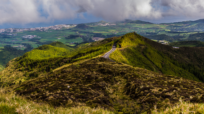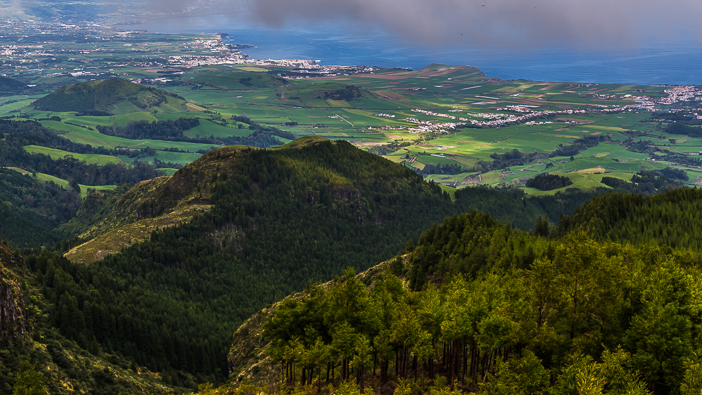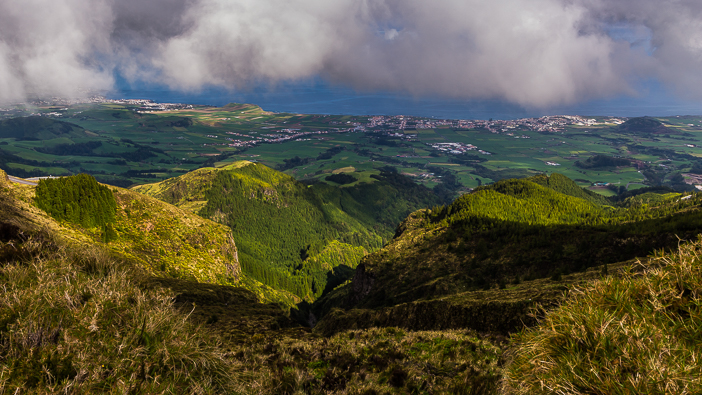Au dessus des reliefs volcaniques, on aperçoit l’océan: partout, Sao Miguel nous rappelle que nous sommes au beau milieu de l’Atlantique…