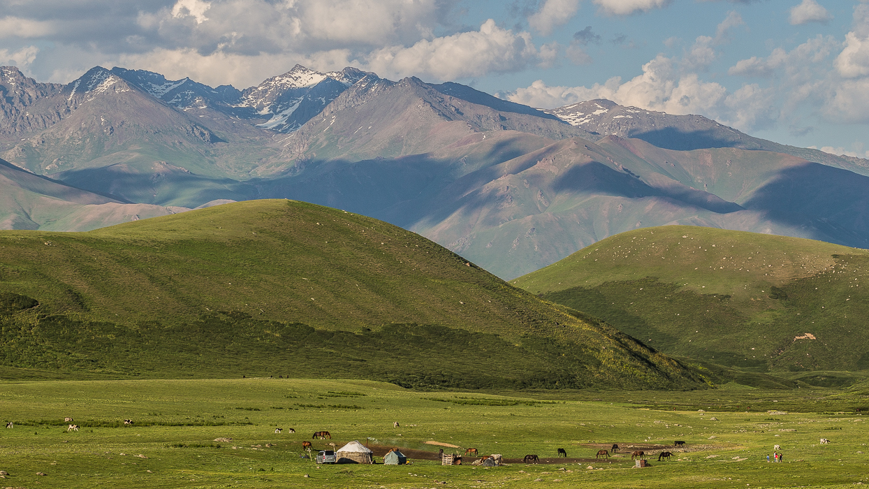 Ce sont désormais 5h de trajet qui nous attendent. Je m’endors, épuisée par les vols, bercée par la voiture. Quelques heures plus tard, le paysage a complètement changé. D’immenses montagnes enneigées surplombent des collines et des steppes verdoyantes qui s’étendent à perte de vue. Des yourtes et des petites roulottes datant de l’ère soviétique s’égrènent tout au long de la route. J’ai l’impression d’être projetée en plein documentaire sur ARTE. Le trajet est rythmé de musiques Kirghizes qui résonnent comme une sorte de Bollywood centrasiatique endiablé.