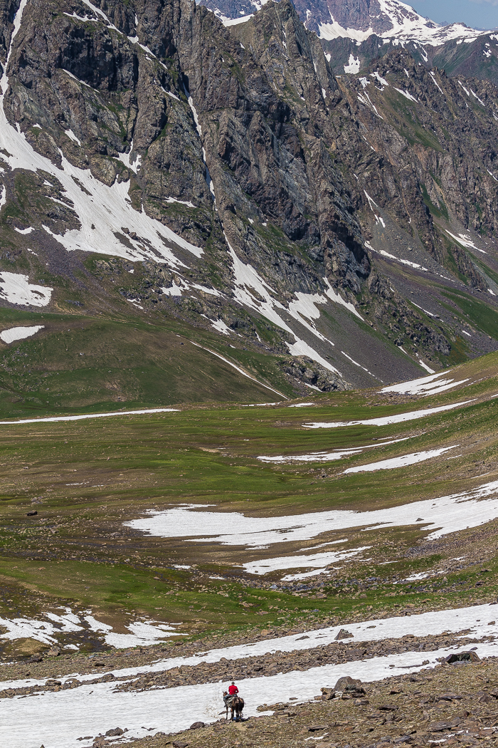 Au loin, l’orage gronde. Le ciel s’assombrit et se fait de plus en plus menaçant. Nous reprenons la route du col. Finalement, l’ascension se fera sous la pluie, le vent et la grêle. Arrivés presque en haut, un dernier effort nous attend : Il faut avancer sur une pente de neige glissante. Une fois parvenus au col, nous commençons à descendre vers la vallée de Kichi-Japirtmakty.