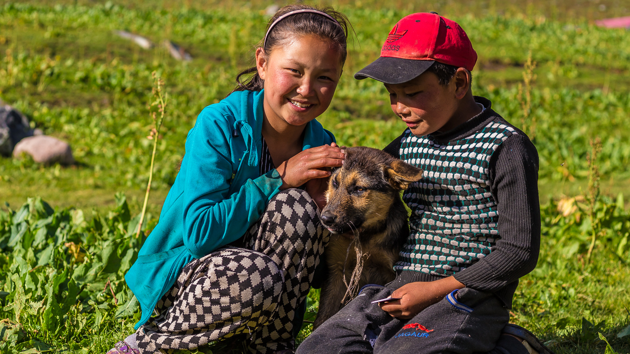 Lorsque nous reprenons notre marche, nous croisons des enfants qui jouent dans la steppe. Ils cessent un instant leurs jeux pour nous regarder passer, l’air curieux. Pensive, je songe à leur vie, ici, au Kirghizistan, avec comme perspective les plaines infinies, les yourtes et les troupeaux de chevaux…