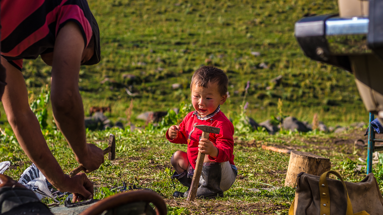 En fin de journée, nous regagnons la yourte. Kolich et d’autres hommes sont en train de ferrer des chevaux. Près d’eux il y a un tout petit enfant, âgé sans doute de moins de 3 ans. Il imite les grands en tapant sur une pierre avec un marteau. Il se fait mal, éclate en sanglots. Mais le petit est vite consolé par son père et son grand-père qui se sont précipités auprès de lui.