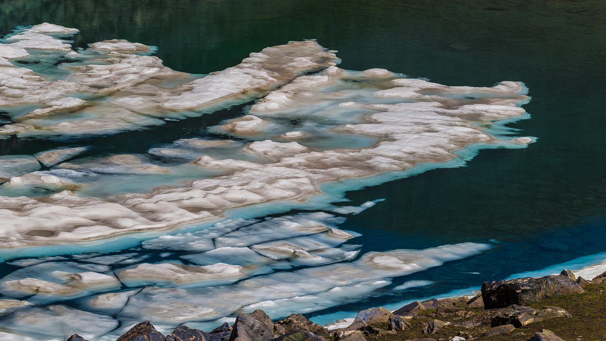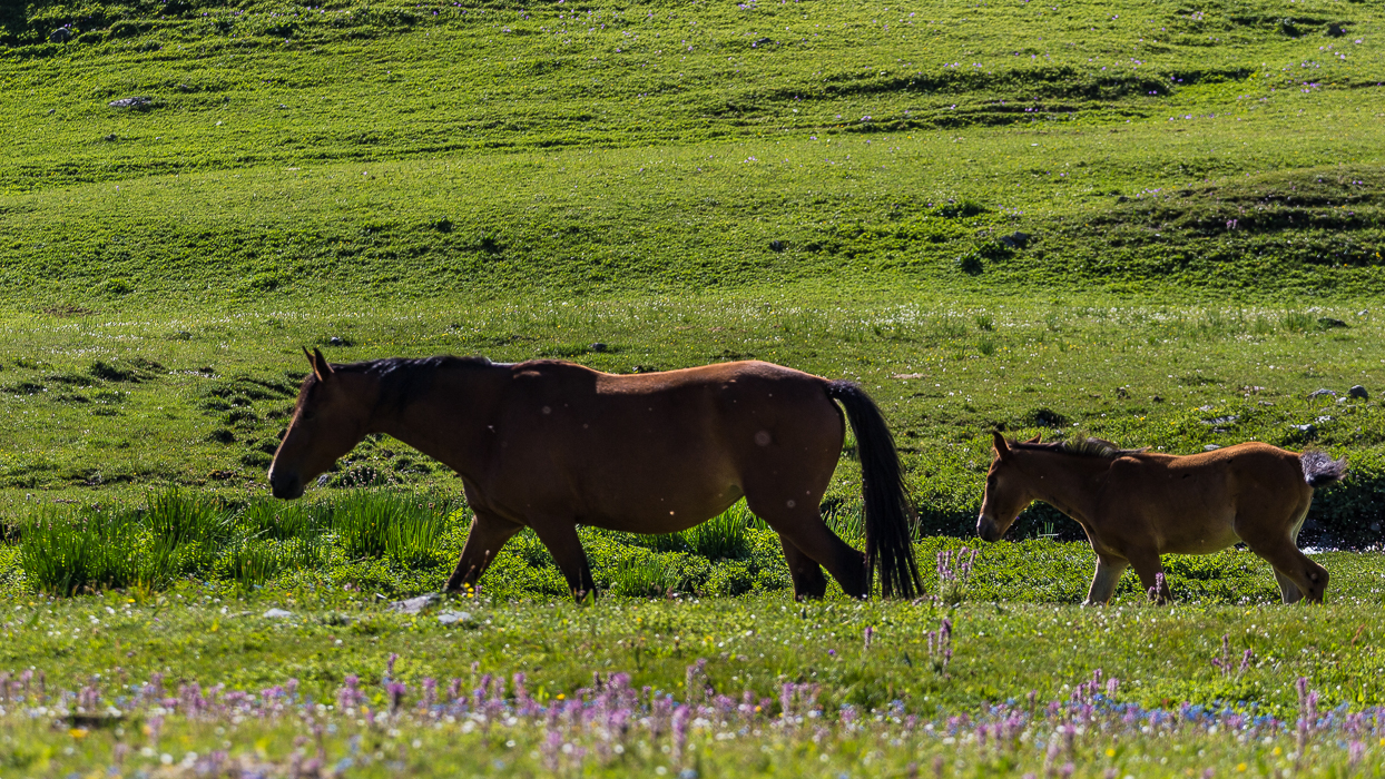 Après le petit déjeuner, nous nous mettons en route. Nous nous frayons un chemin à travers la végétation. Parfois, les hautes herbes nous arrivent jusqu’aux hanches. Nous grimpons de plus en plus, laissant la vallée derrière nous. À plusieurs reprises, nous traversons la rivière à cheval. Nous atteignons deux lacs glaciaires. L’eau est d’un bleu cristallin, c’est magique. Des troupeaux de chevaux profitent du soleil tandis que des poulains nous observent d’un air curieux.