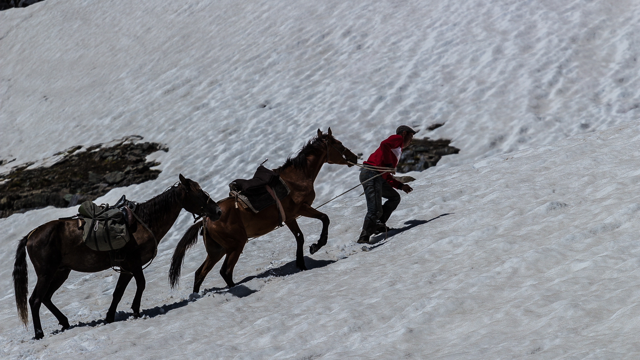 Nous voilà au pied du col à franchir. Comme l’avait prédit Munarbek, il y a beaucoup de neige. Tellement que l’on s’y enfonce parfois jusqu’à la taille. L’effort pour passer le col est intense, Kolich encourage les chevaux.