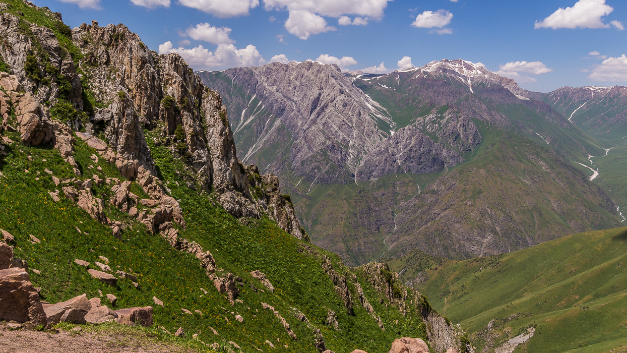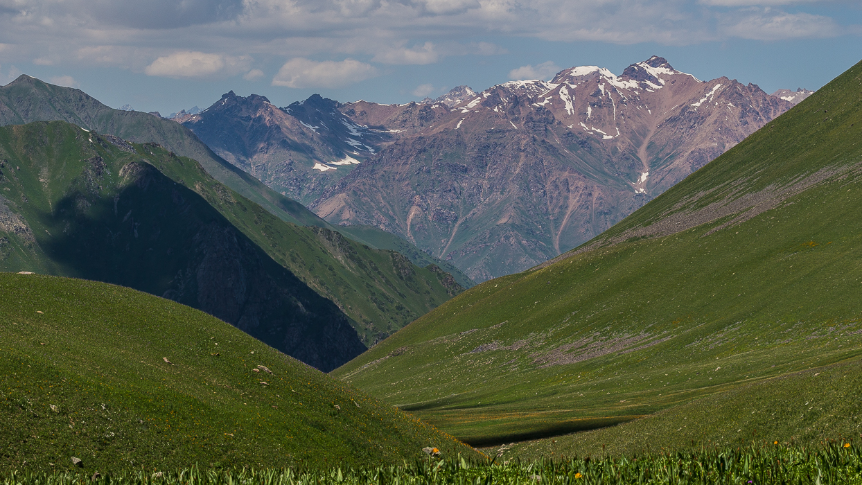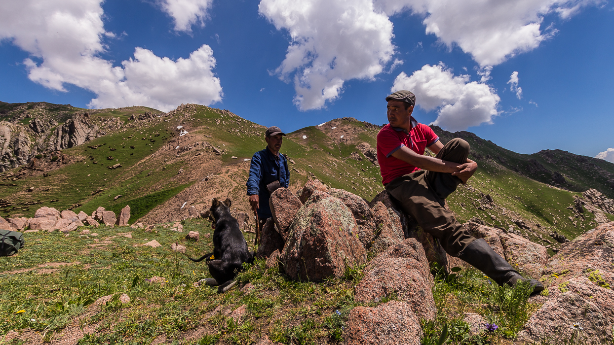 Après plusieurs heures, nous atteignons le col de Jylan-Bazar. Là-haut, nous partageons notre repas avec un berger qui garde son troupeau. C’est un moment simple et agréable, nous échangeons grâce à la traduction d’Alina. Le berger est accompagné de chiens robustes et de chiots curieux. La vue sur la vallée de Ketmen-Tobo, en contrebas, est grandiose.