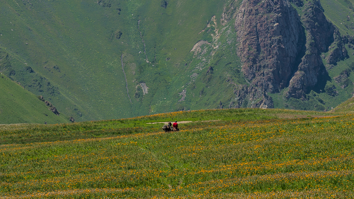 Nous marchons dans les plaines fleuries. Ici, pas de sentier balisé. Pas de sentier tout court, la plupart du temps. Tout au plus, quelques pistes tracées par les animaux et les cavaliers des steppes. Il faut souvent se frayer un chemin à travers la végétation et les pierres, traverser les rivières.